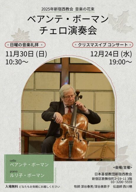 礼拝はボーマン先生のメッセージ、午後は素晴らしいルリ子先生のピアノとチェロ演奏をしていただきます。どなたもお気軽にお出かけください!
